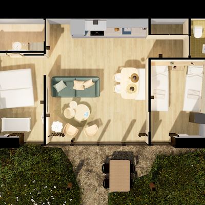 - Twee slaapkamers met twee 1-persoons boxsprings