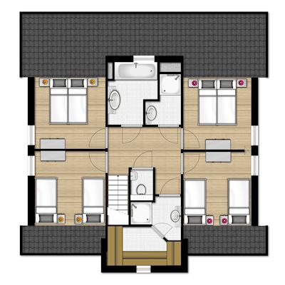 - Vier slaapkamers met twee 1-persoons boxsprings op de eerste verdieping