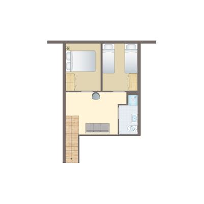 • Twee slaapkamers op de begane grond waarvan één een tweepersoonsbed en de andere eenpersoonsbedden