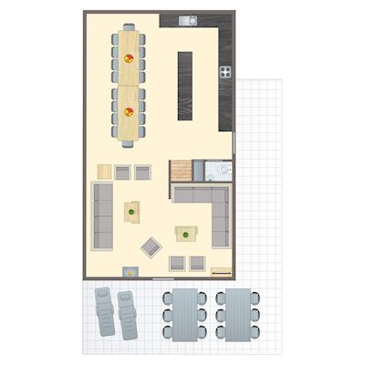 - De huiskameraccommodatie is ingericht als grote huiskamer voor 18 personen met een grote eetkeuken