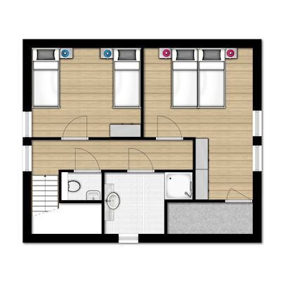 - Twee slaapkamers met twee 1-persoons boxsprings op de eerste verdieping