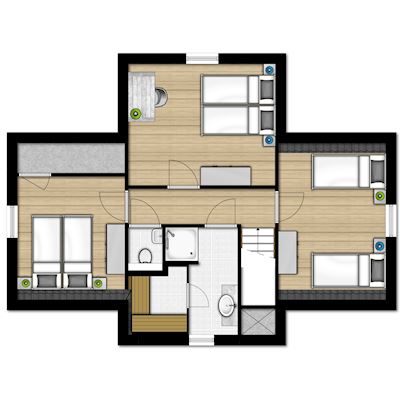 - Drie slaapkamers met twee 1-persoons boxsprings op de eerste verdieping
