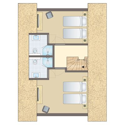 - Two bathrooms en suite with walk-in shower, sink and toilet located on the first floor